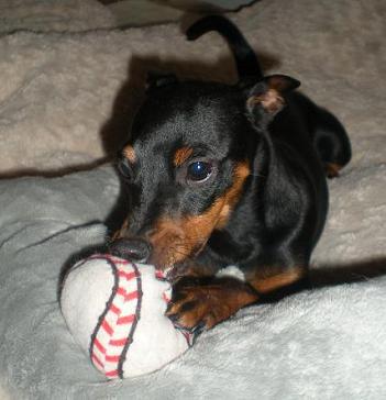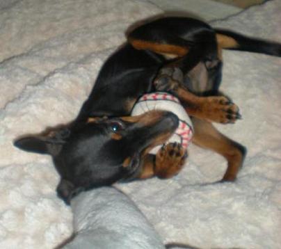 Är en otroligt gullig liten hund men är ett riktigt litet busfrö, just nu är hon i både spökåldern och slyngelåldern och lyssnar inte alltid på vad man säger. Tycker att det är roligt att lära sig nya saker. Något hon tycker är jättekul är att fånga en mjuk boll i luften, är väldigt duktig på det, hon ger genast tillbaks den för att man ska kasta den om igen. Här leker hon med sin mjukisboll.