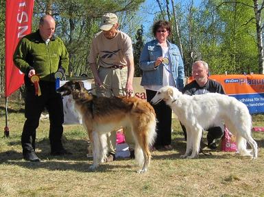 Christian och Sussi, Doris och Ginas uppfödare åkte i fredags ner till Sjöbo med husvagnen för årets första LC-prov. Borzoierna sprang på lördagen, 26 hundar var anmälda. Deya och Gina skulle tävla och de blev lottade emot varandra i första loppet, båda sprang helt fantastiskt och Gina vann med en noslängd och tog trasan.