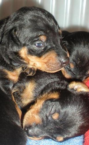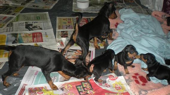 Idag är valparna fyra veckor. De är otroligt duktiga och försigkomna, de morrar, småskäller och busar med varandra och med sin mamma . De har nu fått hela rummet att springa runt i och de går på små upptäcktsfärder. De äter med mycket god aptit maten slukas väldigt snabbt. De har börjat bli väldigt nyfikna på sina leksaker.