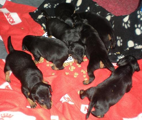Idag är valparna tre veckor. De har fått smaka riktig mat, fick prova redan igår då de visade intresse för Brizbys mat. La lite på fällen och alla valparna kastade sig över maten. Så idag när de fick ett eget fat med mat så var det slut på nolltid. De är nu riktigt aktiva, de morrar och försöker leka med varandra.