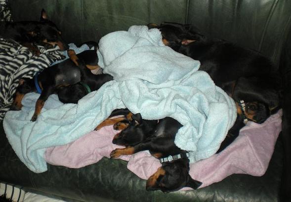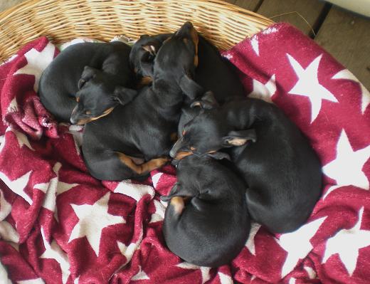 Efteråt var de riktigt trötta. Det blev väldigt trångt i korgen då Amie, Briseis och Tosca ville sova tillsammans med dem. Nu är valparna nio veckor.