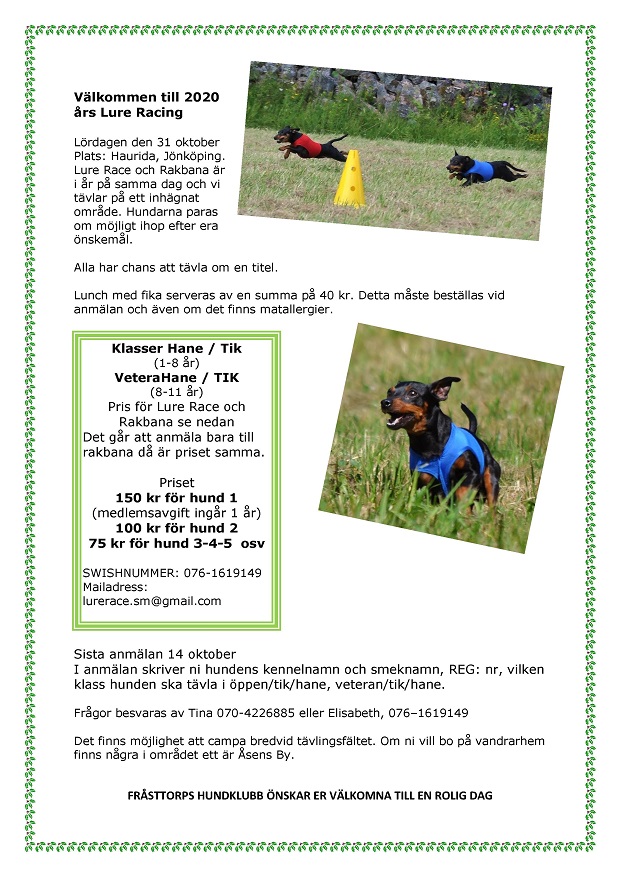 Nu är det bestämt att lure racet kommer att vara den 31 oktober. Vi har valt att i år, p.g.a corona viruset, bara ha en dag med ett lopp lure racing på förmiddagen och sedan rakbana på eftermiddagen. Lure racet har i år ett tio års jubileum vi startade förta gången 2010 och har under åren varit med i lite olika klubbar, 2010-2016 med SSPK och 2017-2018 med Dvärgpinscherklubben och 2019 och nu i år och framöver i Fråsttorps Hundklubb. Vi kommer som vanligt att ha lunch servering och hoppas att vi blir ett stort gäng med entusiastiska dvärgpinschrar och ägare. Välkomna till en riktigt rolig dag.