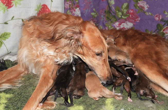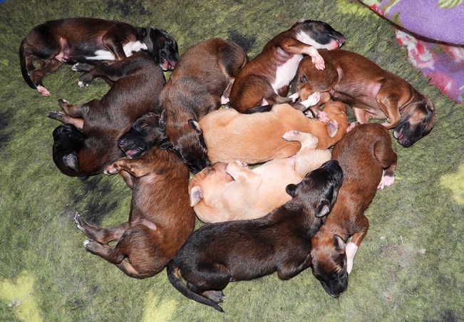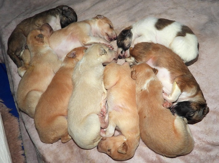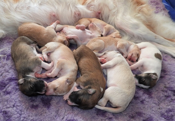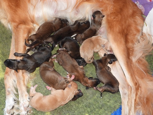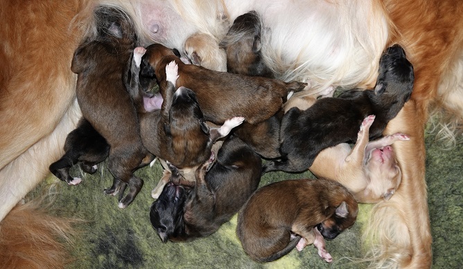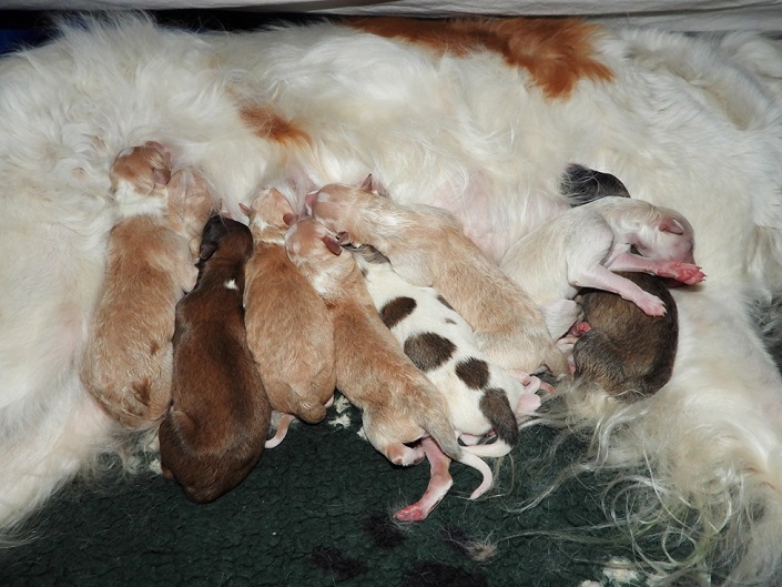 Igår fick Keira sina valpar det blev 9 stycken, 6 tikar och 3 hanar. Vi vägde dem senare under natten och deras vikt var då: hanarnas, 442 gram, 438 gram och 412 gram och tikarnas, 419 gram, 418 gram, 418 gram, 412 gram, 403 gram och 383 gram. Keira är en så duktig mamma och de ska bli så roligt att se dessa små utvecklas, de har så fina färger. Några av valparna finns till salu både hane och tik. Två bilder på dem och fler kommer i deras bildgalleri.