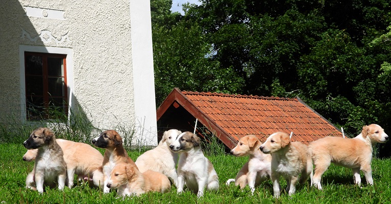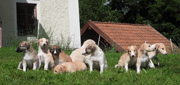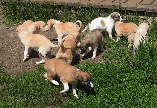I lördags den 25 juli var valparna 5 veckor. De är nu riktigt busiga och går nu på små upptäcktsfärder på tomten. De har träffat småhundarna och kenna, det är väldigt roligt och spännande att vara med dem. De fortsätter att gå upp bra i vikt och vi vägde dem igår och deras vikt var då, alla tre hanarna vägde 3150 gram och tikarnas vikt varierade lite, 3150 gram, 3000 gram, 3000 gram, 3050 gram, 2850 gram och 2700 gram. De är så gulliga och man ser deras personlighet mer och mer det ska bli så roligt att se de utvecklas. Två gruppbilder på dem ute det var lite svårt att få dem att vara helt stilla det var alldeles för roligt och spännande så de ville mest bara busa runt.