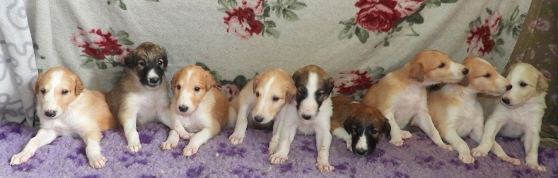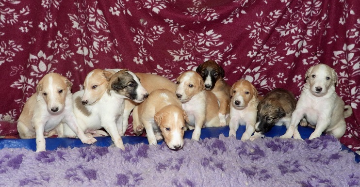 I måndags den 27 juli var valparna 1 vecka. Vi vägde dem idag och deras vikt är nu: hanarna, 898 gram, 882 gram, 875 gram, 763 gram och 642 gram och tikarna 890 gram, 812 gram, 785 gram, 781 gram och 752 gram. De är nu mer aktiva och rör sig ibland lite långt bort från mamma Haylie och då gnäller de när de inte riktigt hittar tillbaka. De har så fantastiska färger och det ska bli så roligt att se hur de blir till slut. En bild nedan och fler i deras bildgalleri.