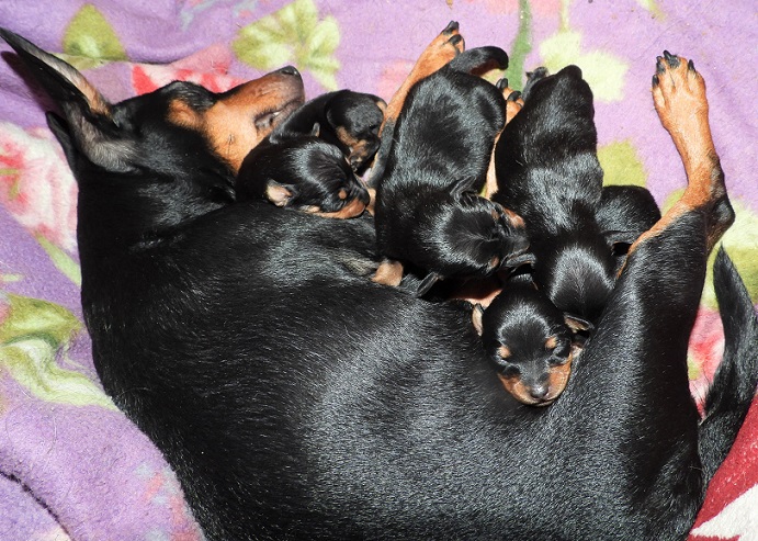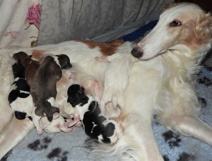 Det blev tyvärr ett kejsarsnitt på Mini då hon hade en död valp som hon inte kunde få ut, värkarbetet stannade helt av. Då hon fick en del blödningar i samband med snittet så bad vi om att få penicillin men de ville inte skriva ut det, jag var rädd för att hon skulle få livmoderinflammation och tyvärr så fick hon det knappt ett dygn senare. Vi fick åka in med henne igen och nu ta bort livmoder och äggstockar, allt gick bra och vi kunde hämta henne till kvällen. Vi fick börja flaskmata valparna och sedan tog det lite tid innan Mini fick igång sin mjölkproduktion ordentligt. Mini och valparna mår jättebra, hon är så otroligt duktig och såret läker fint på henne. En bild nedan och fler kommer i deras bildgalleri.