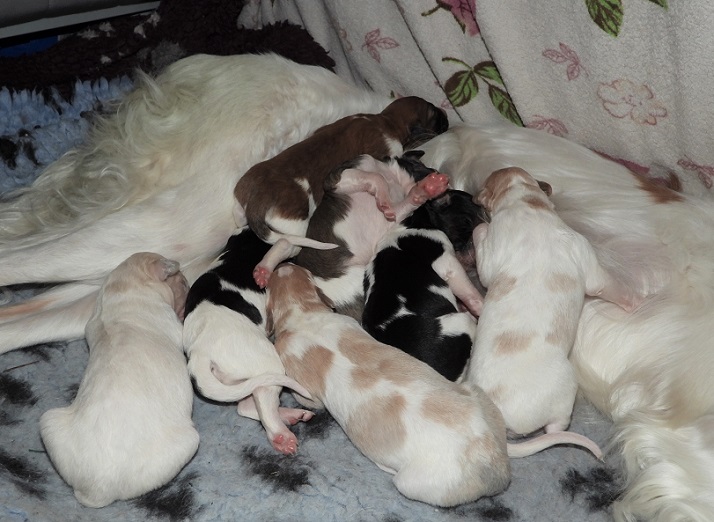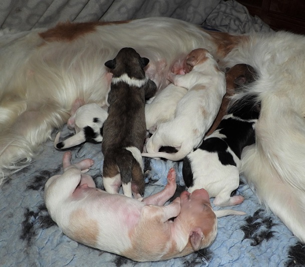 Den 11 februari så födde Keira 7 stycken valpar i jättefina färger, det blev 6 hanar och 1 tik. Keira och valparna mår jättebra och deras födelsevikt var hanarna: 564 gram562 gram, 552 gram538 gram, 534 gram och 518 gram och den lilla tjejen 518 gram. De har fortsatt att gå upp bra i vikt och nu när vi vägde dem idag då de är 1 vecka och 1 dag gamla, så var deras vikt 1117 gram, 1071 gram, 1034 gram, 1021 gram, 1013 gram och 998 gram och den lilla tjejen väger 1023 gram. De är nu mer aktiva och det ska bli så roligt att se de små utvecklas. Ett åar bilder nedan och fler kommer i deras bildgalleri